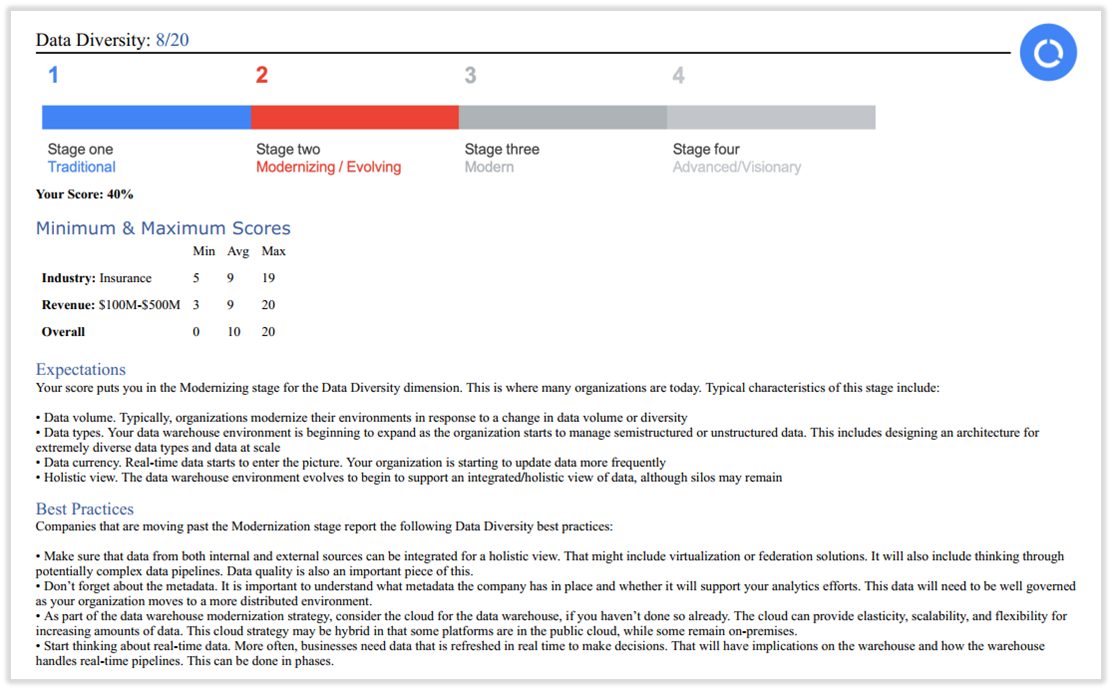 Above, a screenshot of an example DWH Maturity Assessment report from Google.